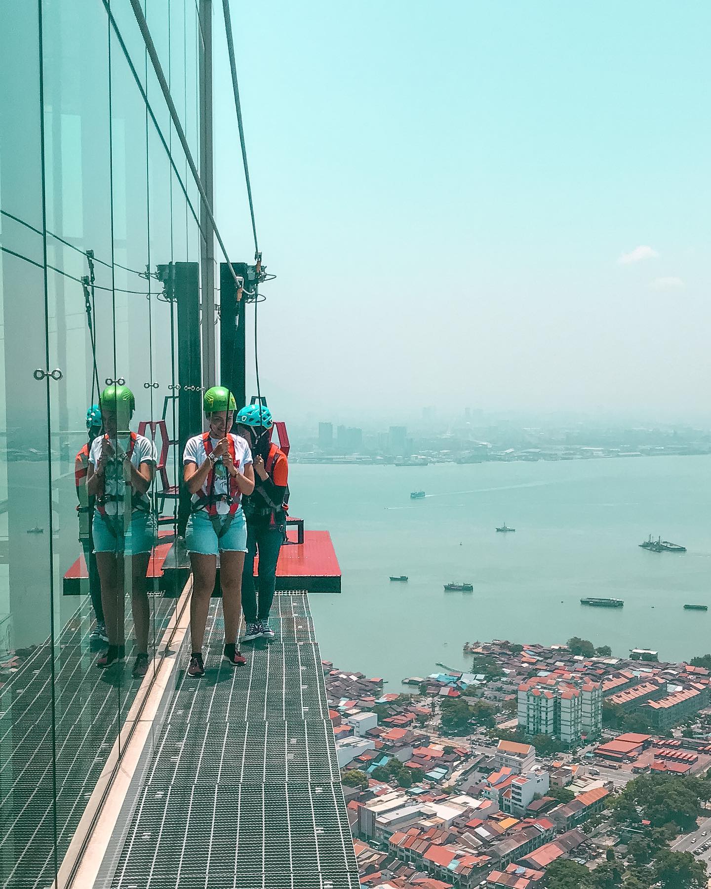 Realmente eso fue solo en nuestras mentes pues al final nos sobró tiempo. Estábamos en Penang, Malasia. Andábamos de nuestra cuenta, pues según mi investigación era fácil de andar y ciertamente así fue. Habíamos dejado de último visitar el “GRAVITYZ” yo estaba súper emocionada pues era un lugar lleno de adrenalina, pero cuando ya tocaba ir para allá vimos el reloj y solo disponíamos de par de horas y dijimos y si hay fila ? Y si no conseguimos taxi para regresar? Bueno sin mucho pensar nos arriesgamos! Llegamos y gracias a Dios no había nadie en fila, pero si había que llenar un papeleo, listo lo llenamos, nos pregunta que de donde somos le decimos que República Dominicana abrió los ojos y dijo y donde es eso, mucha explicación y finalmente entiende donde es.. Se presenta un problema con el pago pues no estaban tomando TC, el tiempo pasaba, yo con los nervios de punta por el crucero y por lo que estábamos a punto de hacer.. finalmente nos aceptan el pago con TC y aparte de eso dan un descuento porque “veníamos desde muy lejos y nadie de RD había ido allá”.. yo Feliz, pero nerviosa! Todo listo! Nos suben al ascensor y nos despachan al piso 65 De la Torre Komtar donde está el “World’s highest Rope course” a todo esto ya yo no se porque estoy mas nerviosa … le digo al guía que nos toco mira tenemos que hacer esto rápido que andamos en el crucero… para no cansarles el cuento pudimos terminar el recorrido y llegar con tiempo de sobra al barco.. a veces hay algunos riesgos que valen la pena .. pero solo a veces UFF!! .